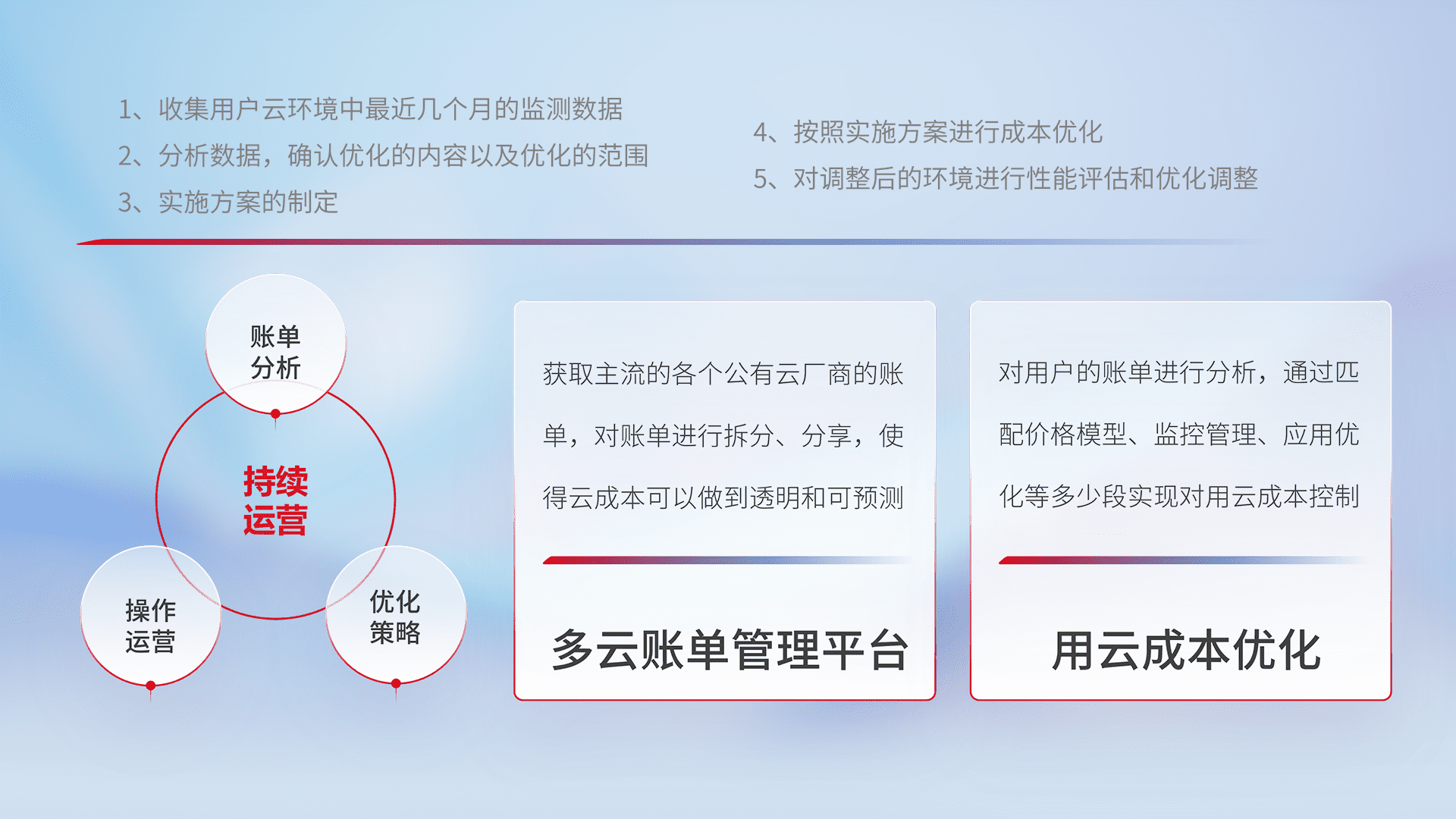 通过多云纳管,,以统一的资源数据模型把客户的云资源进行抽象和封装,,,进而实现对多云资源的统一操作,,,,保障云资源管理的可靠性、、、稳定性与可用性。。。。量身定制化运维内容,,,配置、、开发运维、、、、补丁管理、、、、备份、、监控、、、、认证和访问管理、、、、审计和日常巡检等,,,保障在用云过程中的可靠度,,稳定度以及高可用率。。。